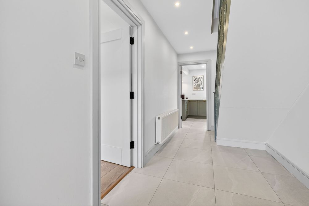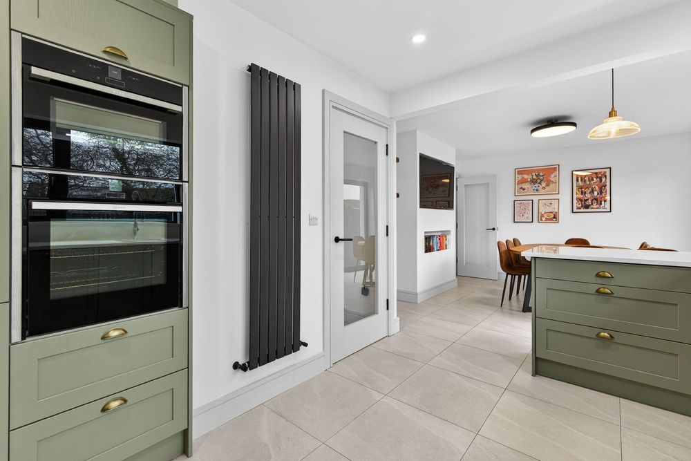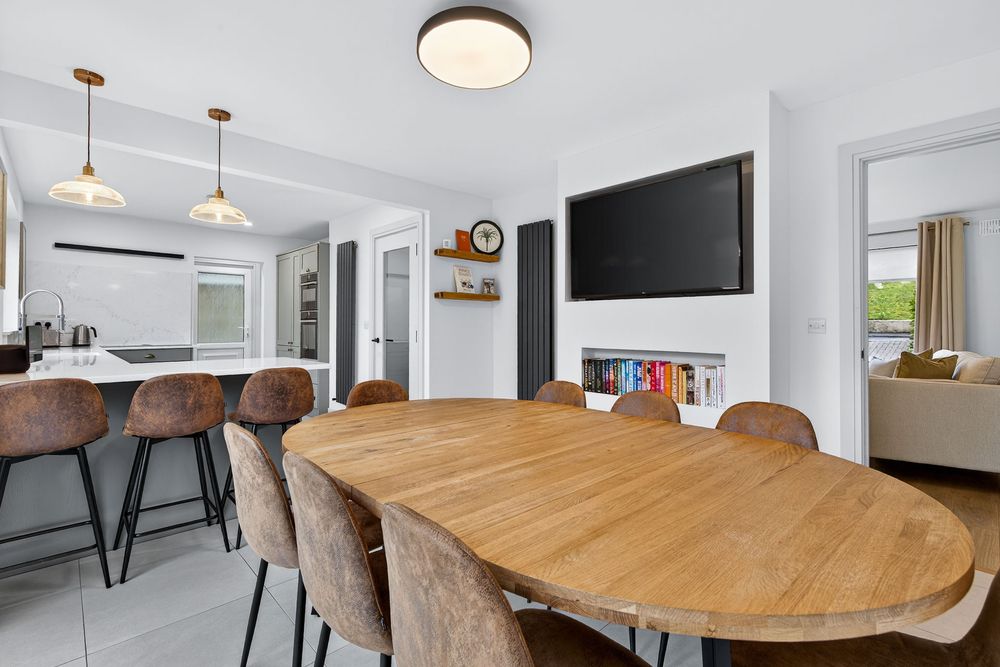 Finished with tiled flooring. It includes a fully fitted kitchen, a glazed internal door to the hallway for additional natural light and large glazed sliding doors opening from the dining area onto the rear patio with an attractive outlook over the private rear garden.