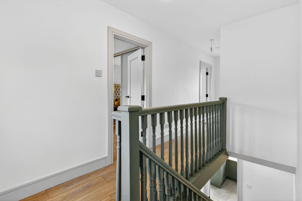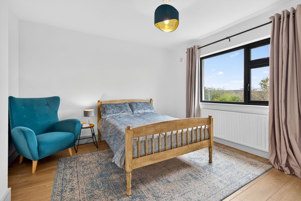Finished with laminate wood flooring. Like the main bedroom, it is south facing and overlooks the large green area opposite the property.