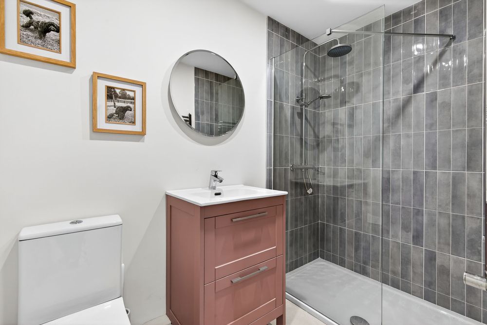 Fitted with a toilet, wash hand basin with vanity unit, fitted mirror, large walk-in shower, heated towel rail, tiled flooring and full tiling around the shower area.