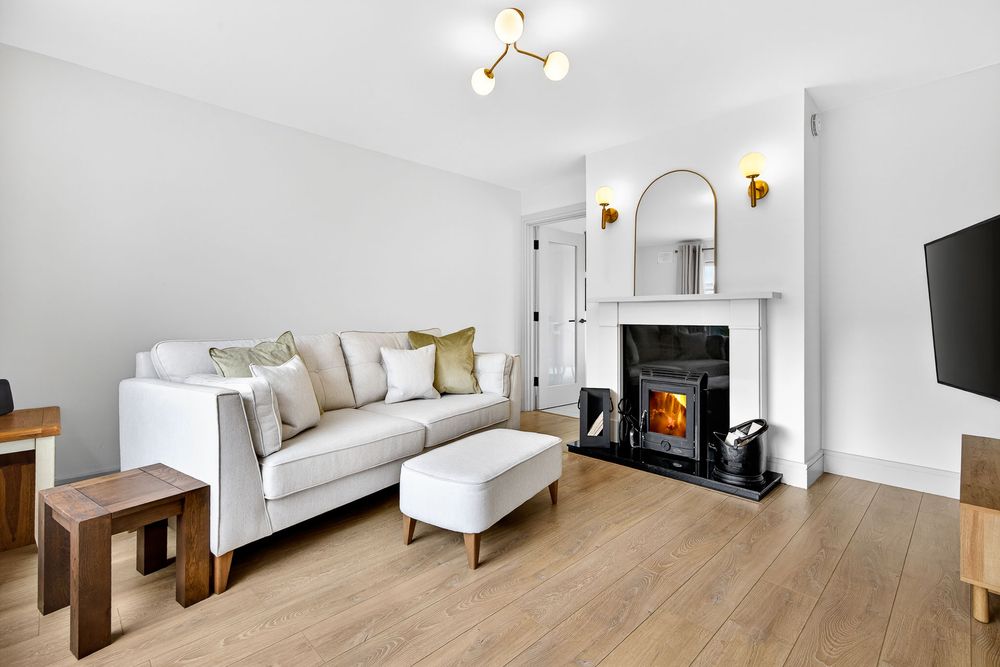 Finished with laminate wood flooring. It features an insert stove in the fireplace, a large south-facing window overlooking the front paved driveway, access from the main hallway and a further door to the kitchen/dining room.