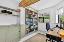 Finished with timber flooring. It includes built-in shelving and cupboards and offers an ideal home office space with south-facing windows overlooking the front drive.