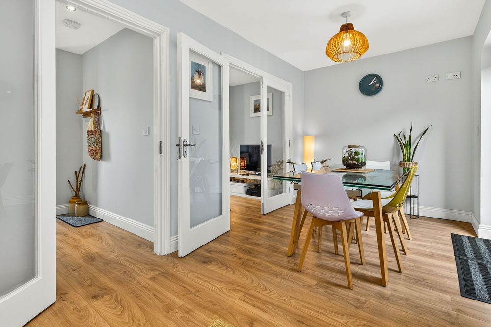 Wooden flooring. Inset stove. Double glass door to kitchen/ dining.