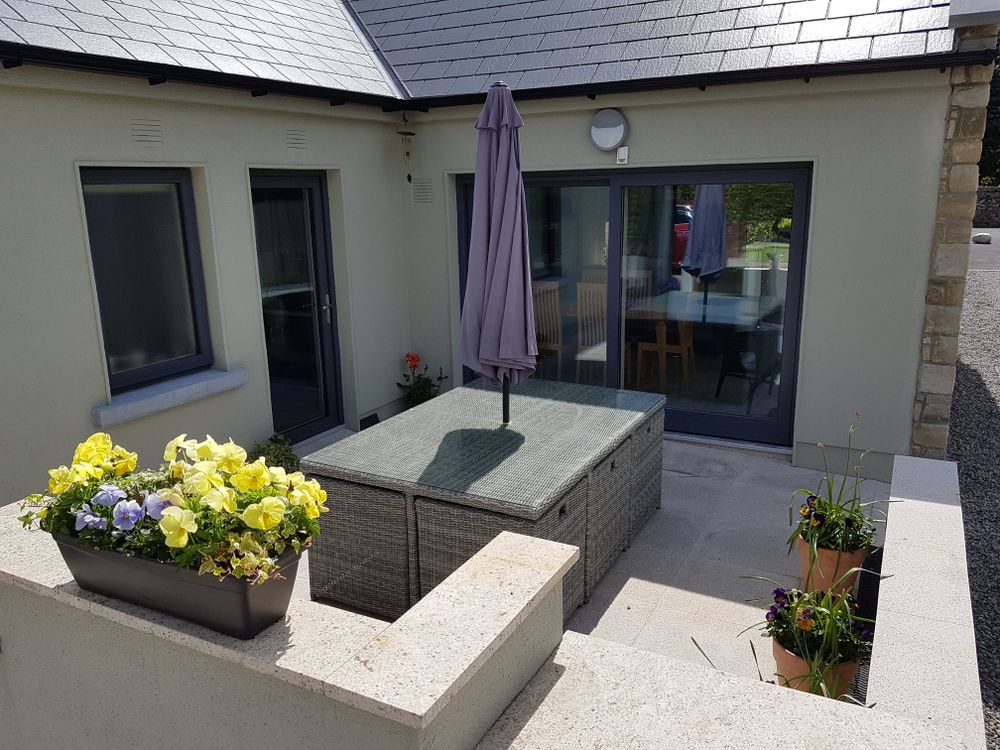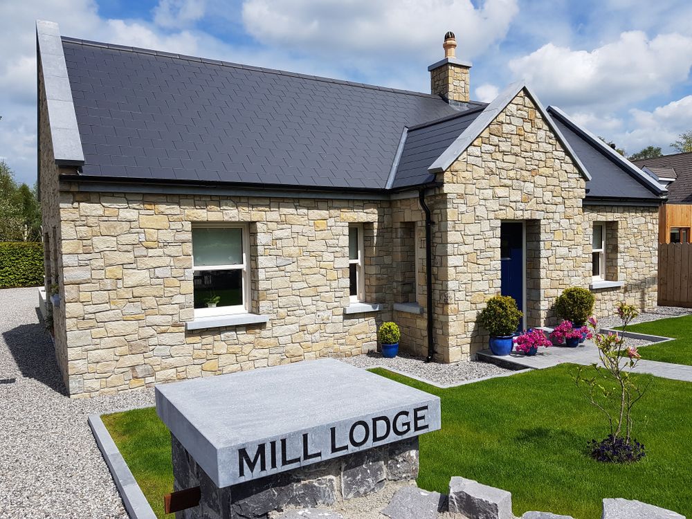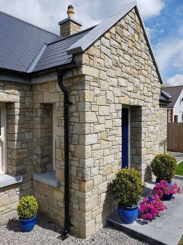 Experience the perfect blend of traditional Irish charm and modern luxury with this exquisite stone cottage-style property. The house boasts a striking façade of cream and golden sandstone, complemented by a sleek, dark slate roof. This property, offers a warm and inviting exterior that stands out in any landscape.