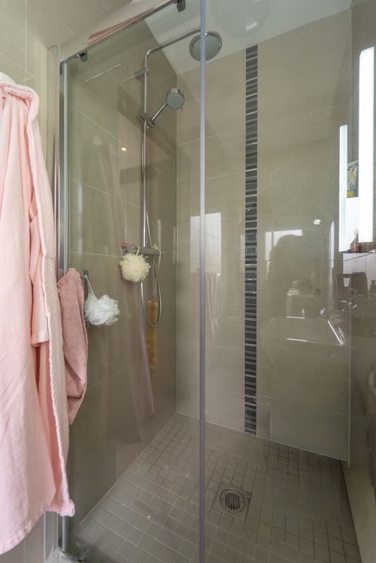 The family bathroom is meticulously finished, from the premium tiling that lines the space to the sleek walk-in rainfall shower. A bespoke vanity unit adds both style and functionality, completing a tranquil environment perfect for unwinding.