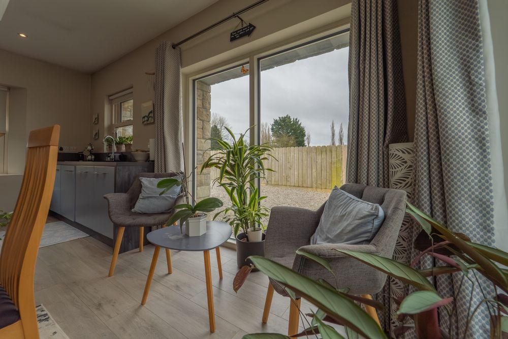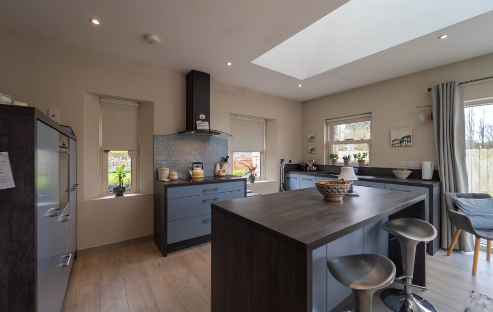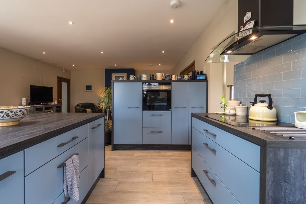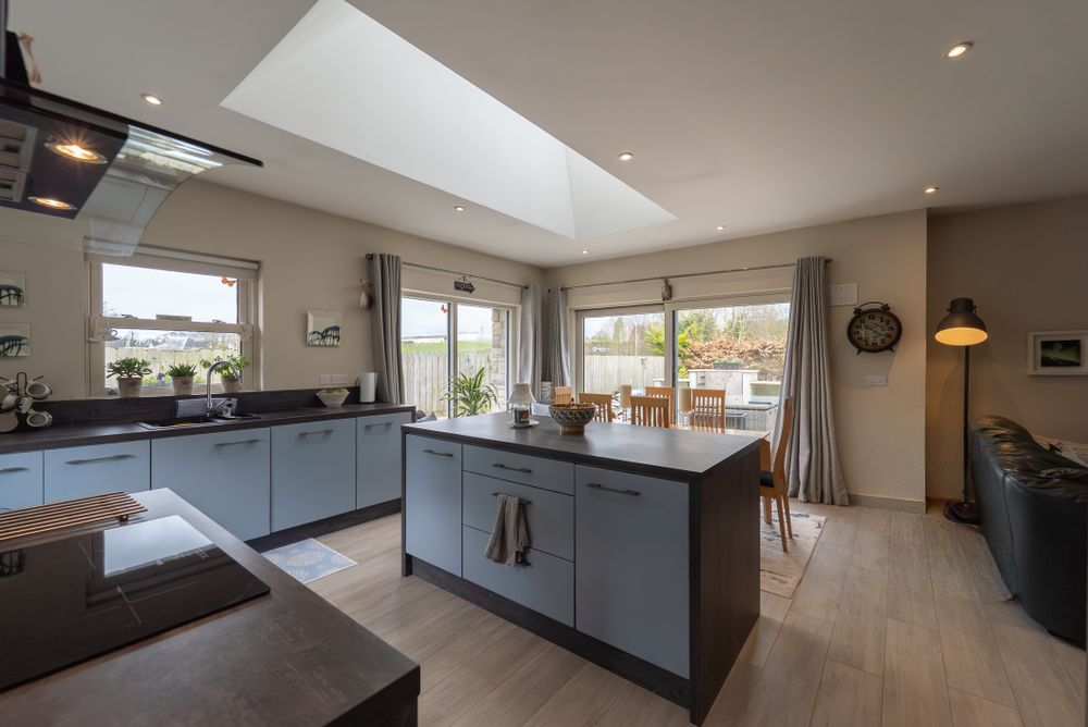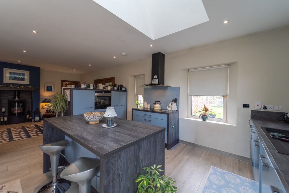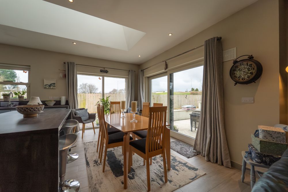 Beyond the welcoming entrance porch, French doors lead you into a spacious, light filled , open plan area to include a gally-style fitted kitchen with integrated appliances and a breakfast bar serving as extra storage and a seating area, all bathed in natural light from a remote-controlled skylight. The adjoining dining area is designed for the entertainer, offering panoramic views and opening directly onto a beautifully laid granite patio for a seamless indoor-outdoor flow.