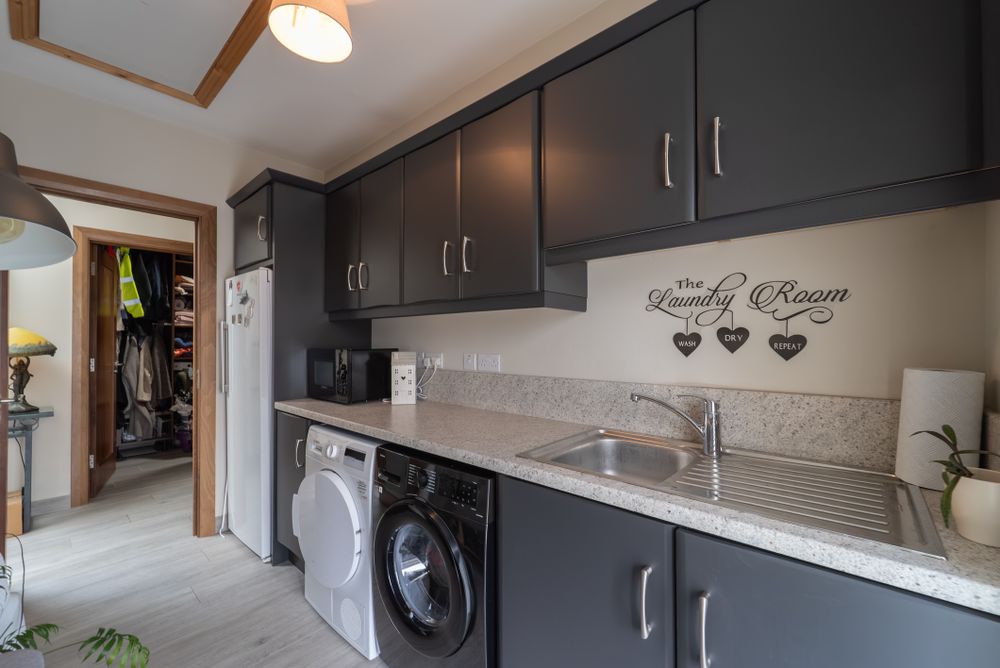 The galley-style utility room is designed for maximum efficiency, offering an abundance of storage while doubling as a practical boot room. Strategically positioned, it provides a convenient secondary access point that leads directly to the central patio