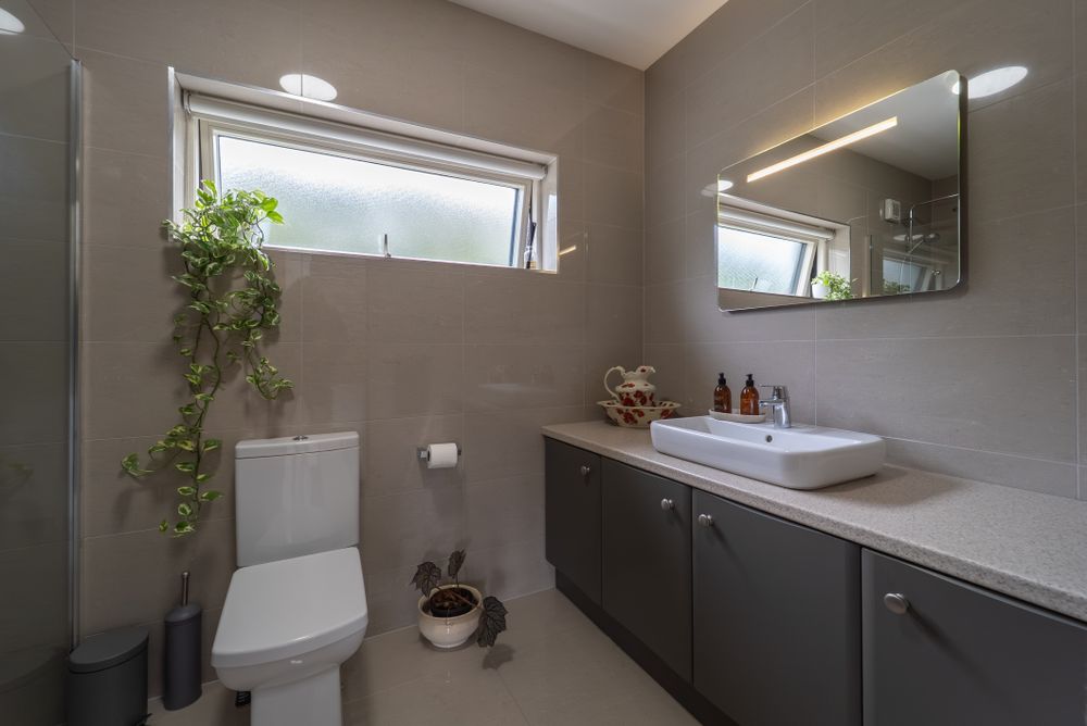 Beautifully finished with floor to ceiling high quality porcelain tiling, wall to wall fitted vanity unit providing ample storage and topped with contemporary vessel sink, wall mounted illuminated mirror, walk in shower area with dual-head shower system, clerestory window with black out roller blind.