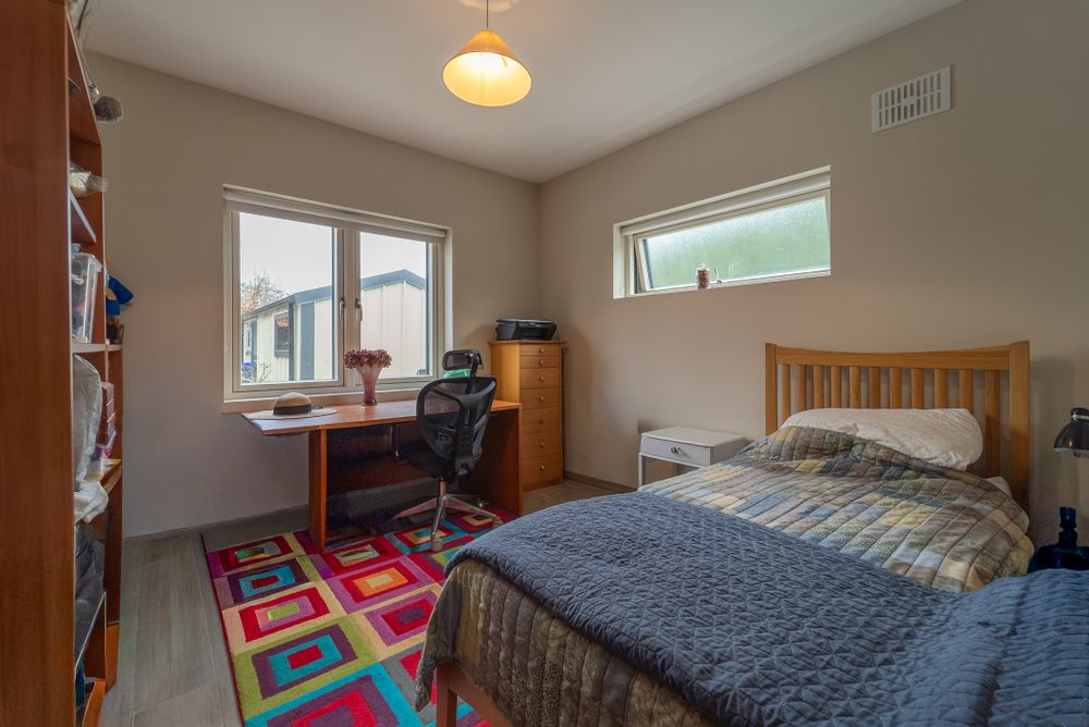 Double bedroom with wood effect tiled flooring, light fitting, dual aspect windows with one being a clerestory window allowing for brightness whilst maintaining privacy, black out roller blind.