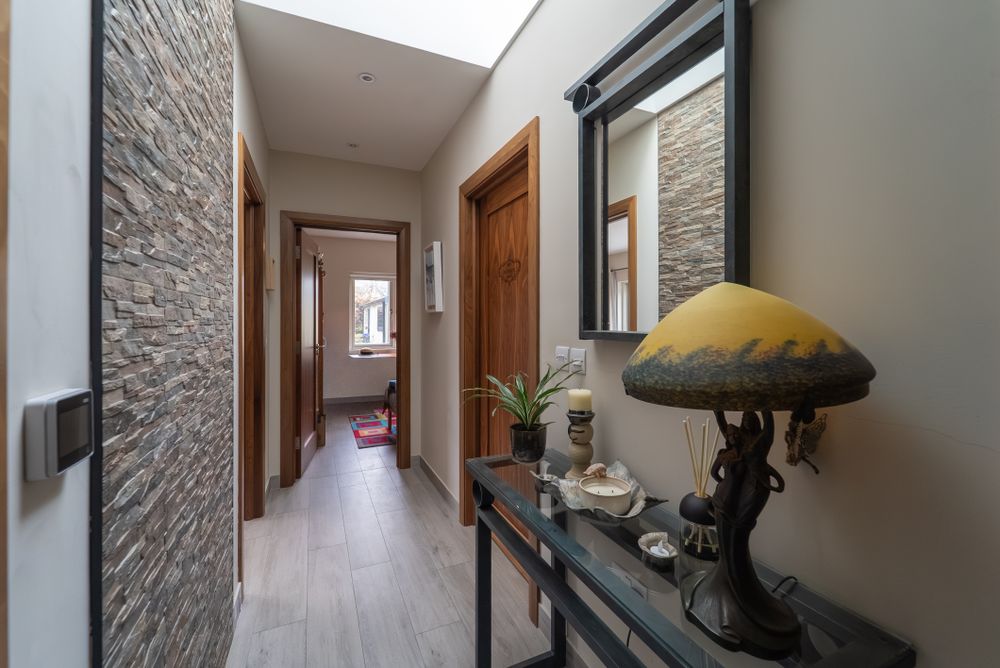 Moving from the living area, you enter a sun-drenched central hallway leading to the bedrooms and bathroom.