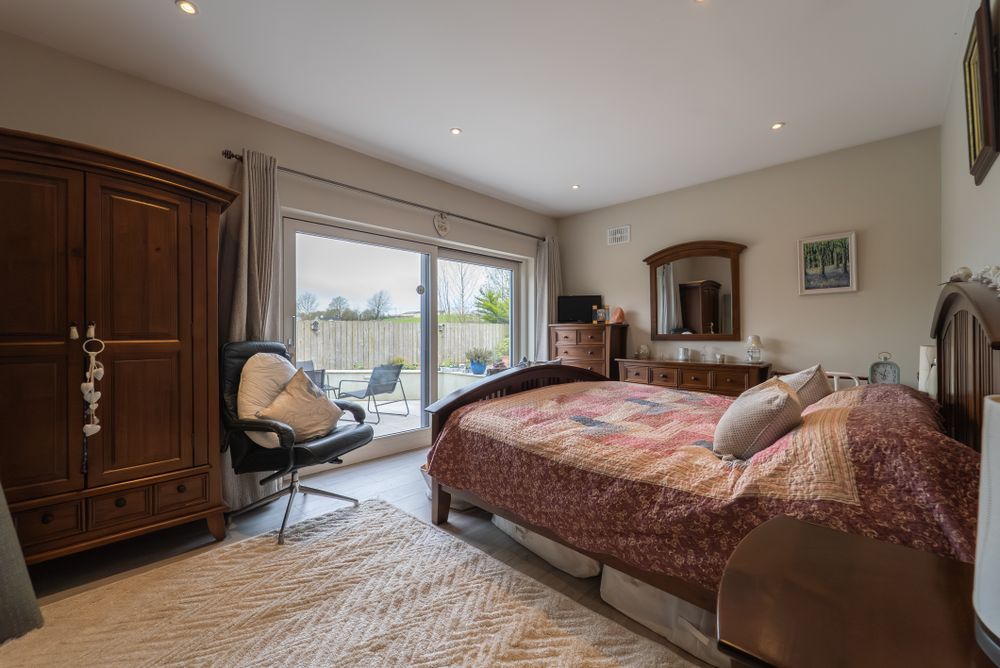 Beautiful master suite with lift and slide door that opens onto the granite patio area , wood effect floor tiling, recessed lighting.