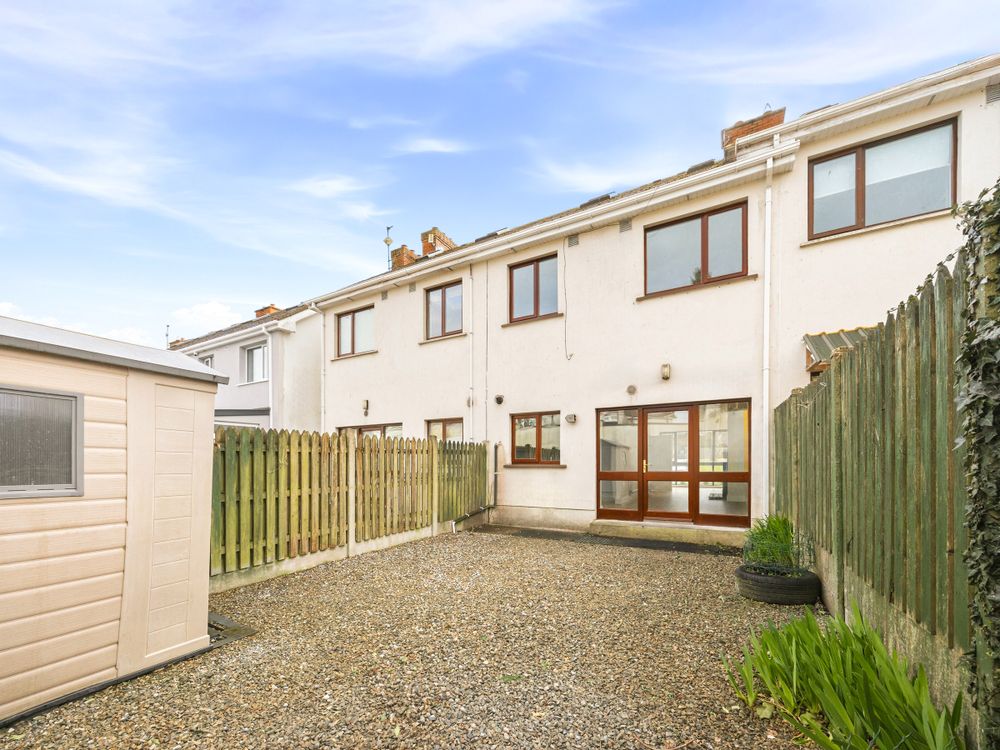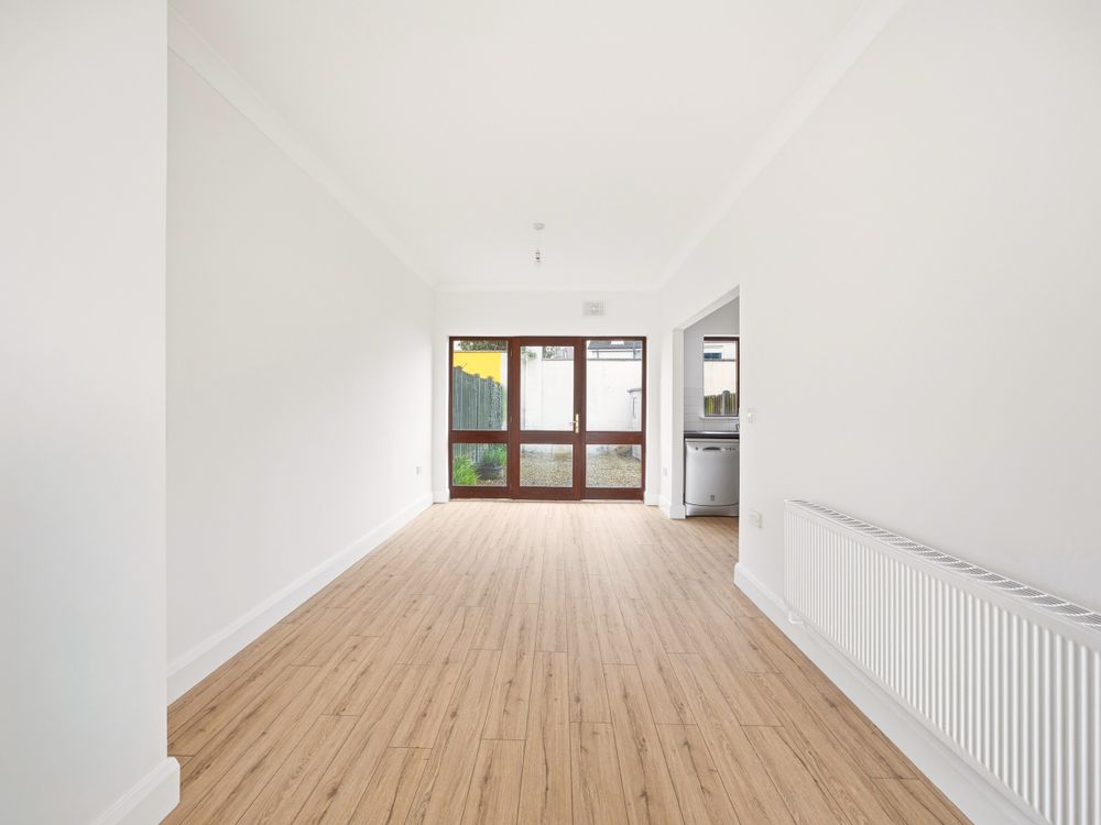 On entering this home, the hallway is bright and welcoming. To the left leads into a spacious sitting room and dining area complete with wooden floors throughout, coving and feature fireplace. The main living area flows from the front to the rear of this family home with dual aspect windows and lots of bright space. There is a fully fitted kitchen with plenty of storage presses & worktop space. There is a patio door leading out to the rear garden, which is a good size. There is also a downstairs W.C.