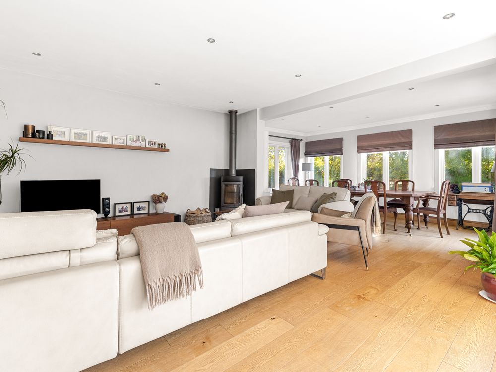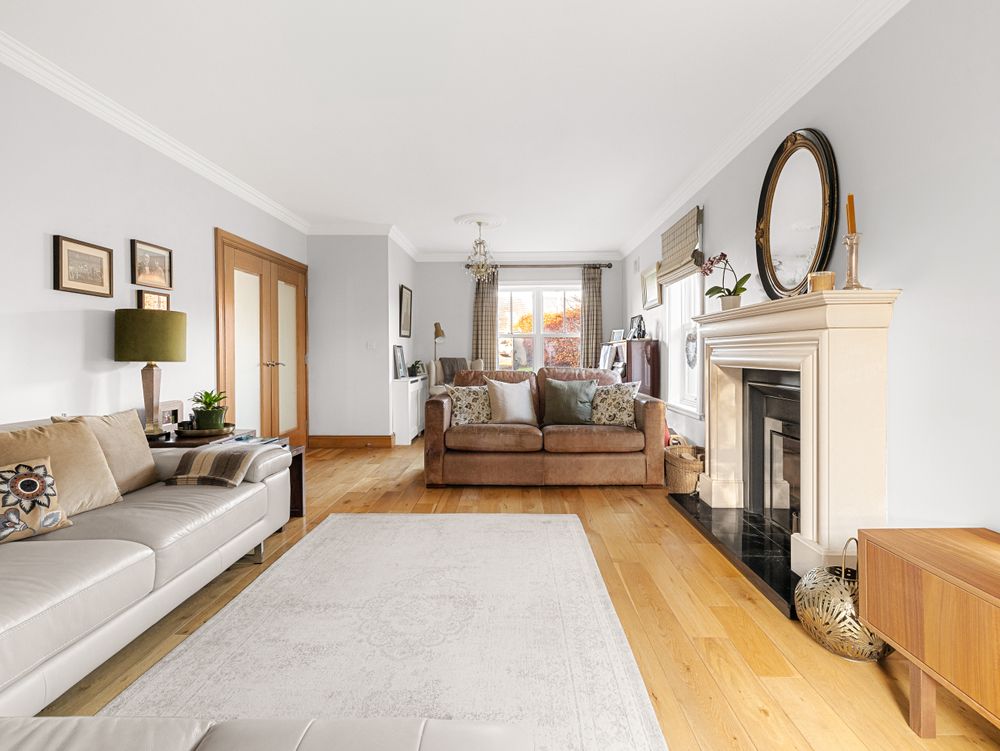 Accessed through gates, a large driveway provides ample parking for multiple cars and is framed by mature hedging and trees that enhance the sense of privacy. On entering the home, you are welcomed by a bright and spacious hallway that immediately sets the tone for the quality and space throughout.