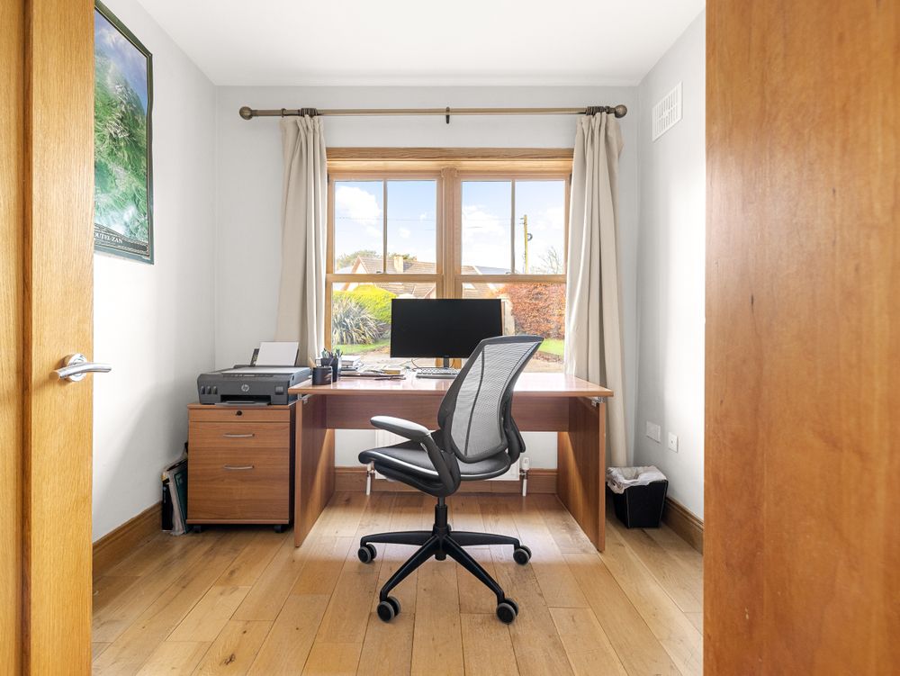 To the left, through double doors, lies a spacious sitting room finished with wooden flooring and decorative coving, and centred around a charming fireplace with built-in stove. Multiple windows allow natural light to flood the room, creating a warm and inviting space ideal for both relaxing and entertaining. At the heart of the home is a beautifully designed open-plan kitchen, dining and living area. The modern kitchen is fitted with stylish cabinetry, quality appliances, generous worktop space and a large central island with seating, perfect for family gatherings and casual dining. The spacious dining area overlooks the rear garden, while the adjoining seating area with cosy stove creates a comfortable space for everyday living. Just off the kitchen is a large utility room with additional storage presses, along with a convenient downstairs WC. A separate office located just off the hallway completes the downstairs accommodation.
