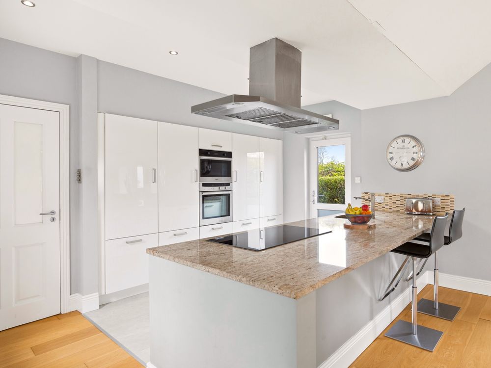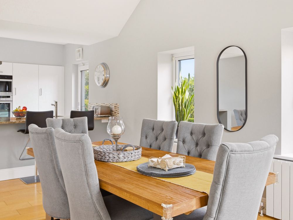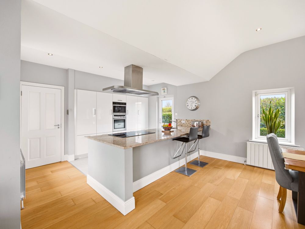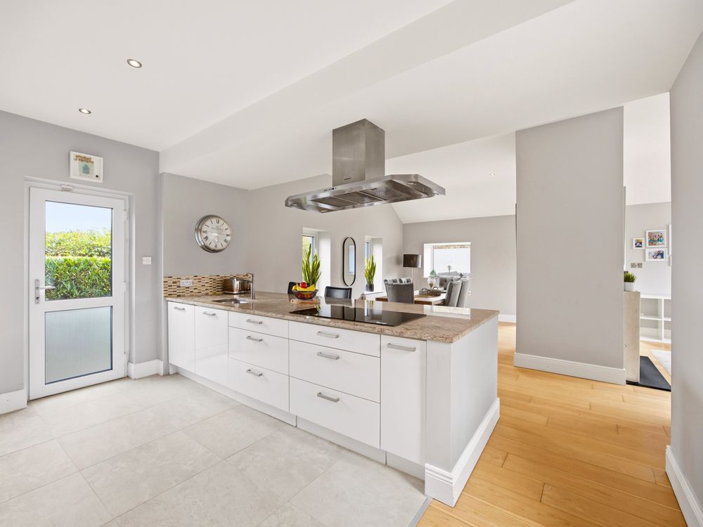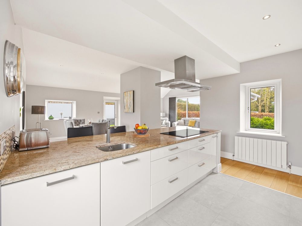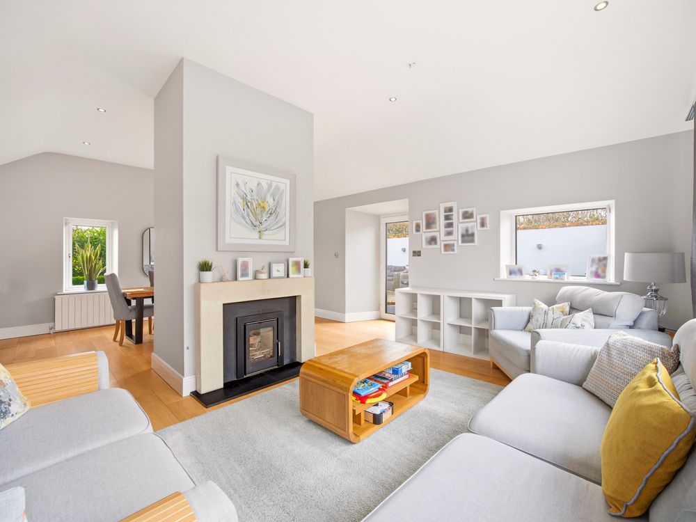The living accommodation flows back into the hall, where a sleek, modern kitchen opens seamlessly to a dining area and living space. These rooms are subtly defined by a central chimney breast housing a cosy fuel burning stove. The multi aspect windows continue the homes signature theme, drawing an abundance of natural light through, creating a wonderful setting for both relaxed living and effortless entertaining. The kitchen features newly installed units with solid Shiva Granite countertops and integrated appliances and is further enhanced by a generously sized utility room. This practical space is fully fitted with base and eye level units and accommodates an American style fridge freezer alongside the laundry appliances.