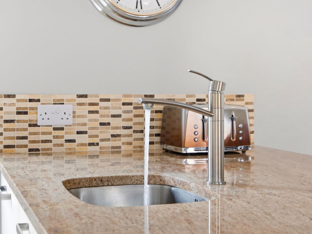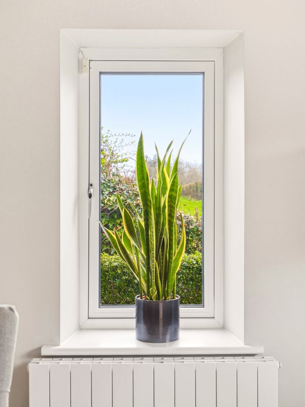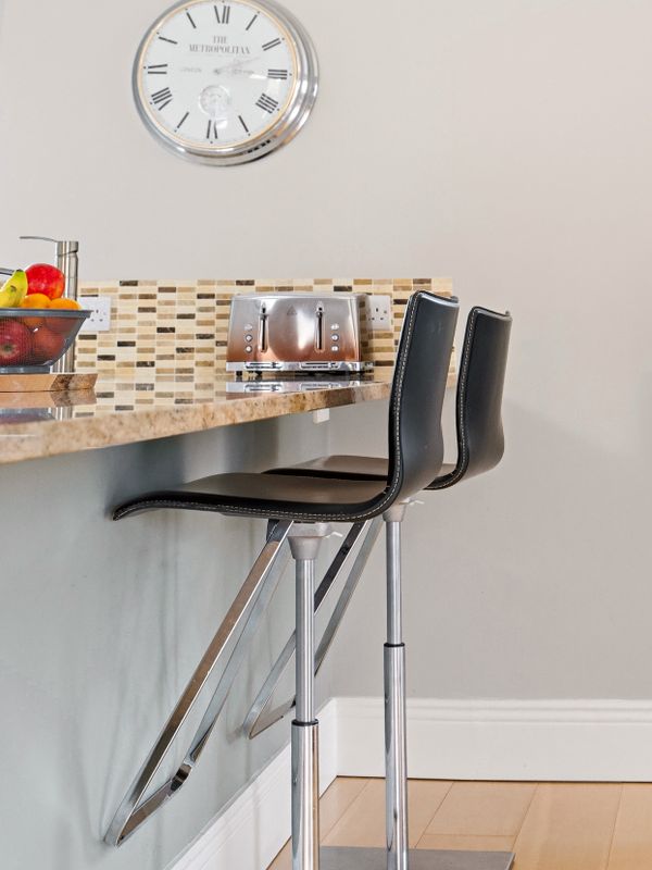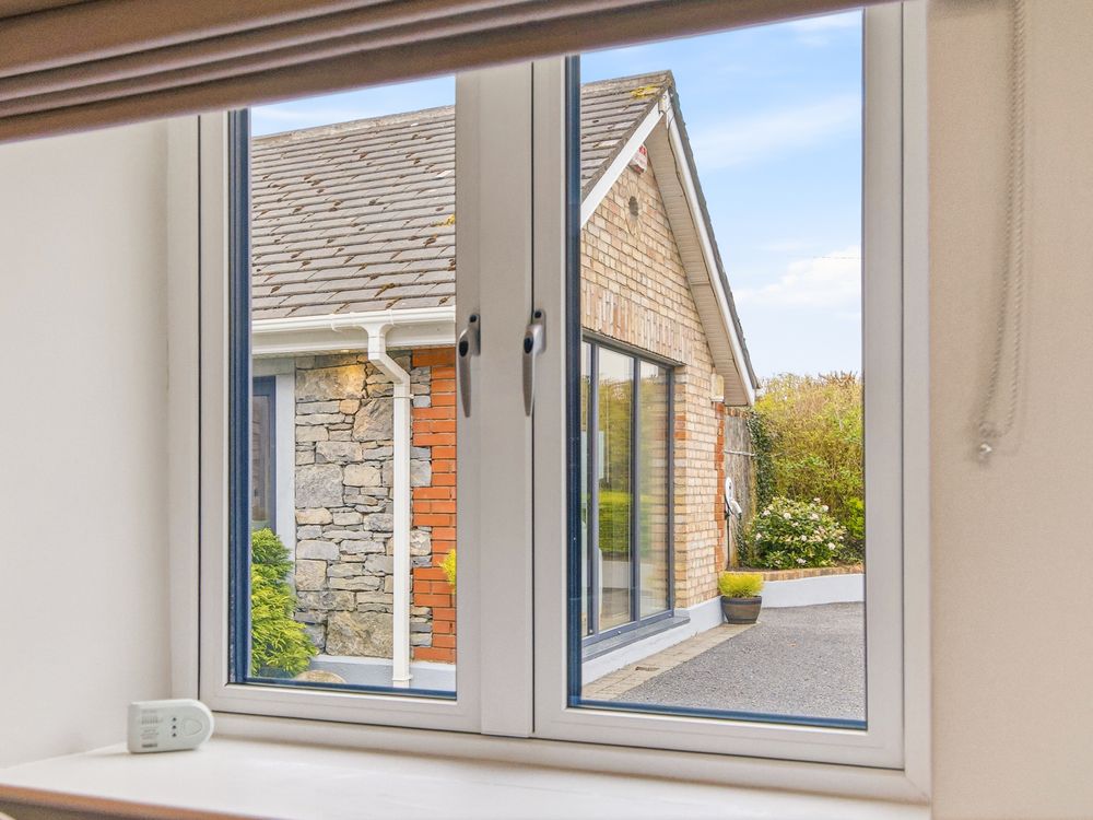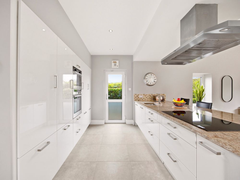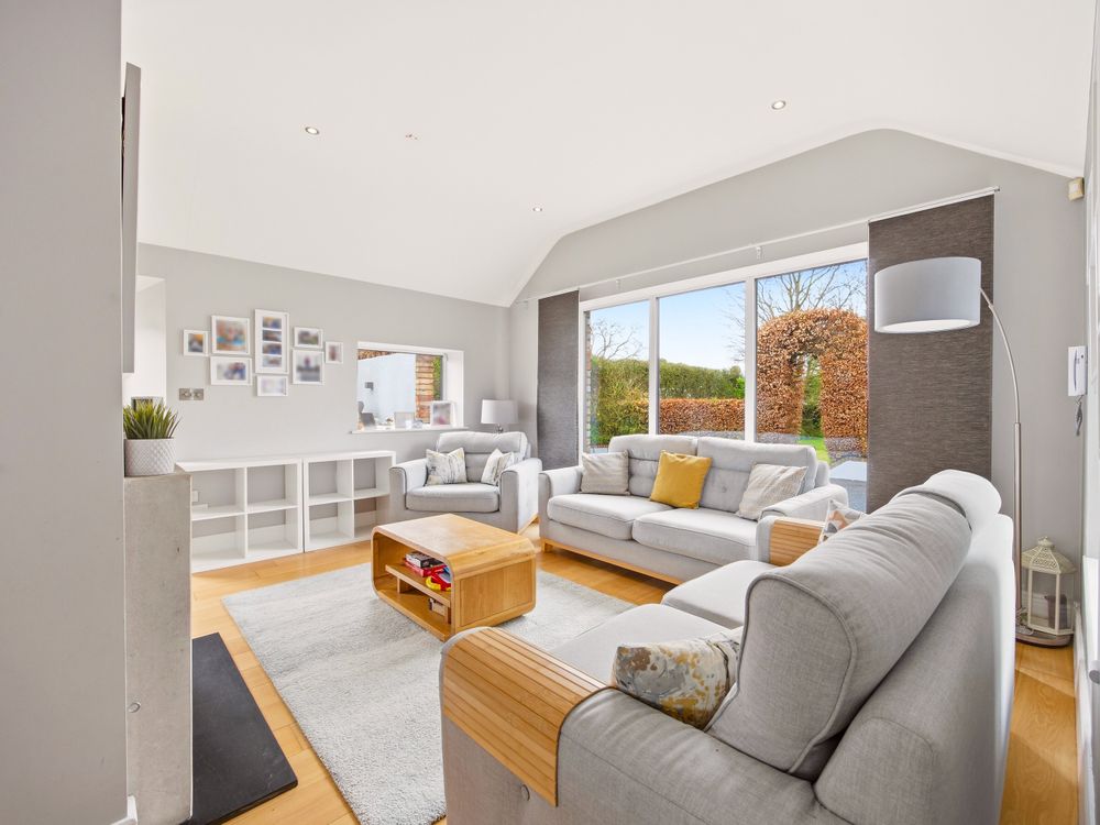 The living accommodation flows back into the hall, where a sleek, modern kitchen opens seamlessly to a dining area and living space. These rooms are subtly defined by a central chimney breast housing a cosy fuel burning stove. The multi aspect windows continue the homes signature theme, drawing an abundance of natural light through, creating a wonderful setting for both relaxed living and effortless entertaining. The kitchen features newly installed units with solid Shiva Granite countertops and integrated appliances and is further enhanced by a generously sized utility room. This practical space is fully fitted with base and eye level units and accommodates an American style fridge freezer alongside the laundry appliances.