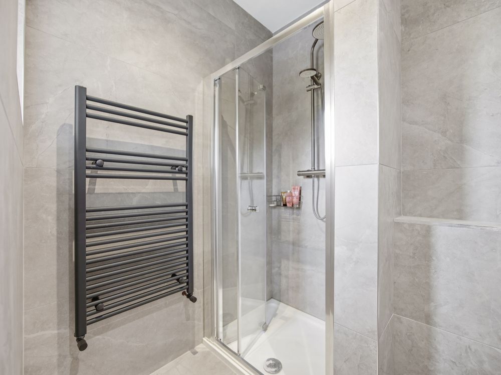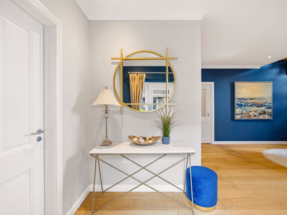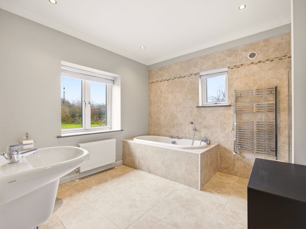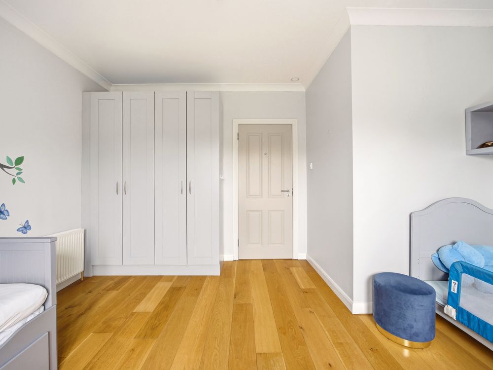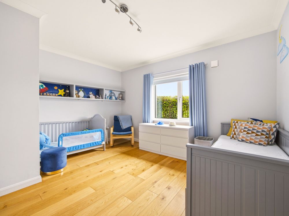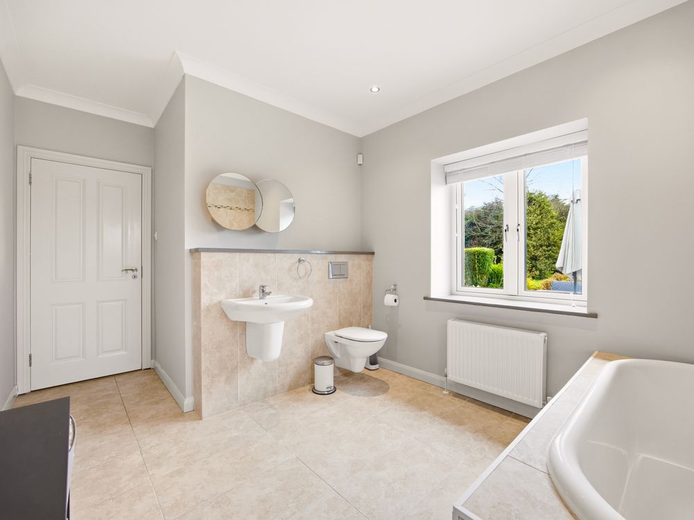 Moving across the hall along the solid oak floors you will find the bedroom accommodation. The principal bedroom suite comprises a beautifully appointed double bedroom with patio doors opening directly onto the garden. It is further enhanced by a superbly finished, fully tiled en suite complete with a walk in shower. Completing the space, is a walk in wardrobe with full height hanging and bespoke storage, creating an exquisite dressing space. Moving on to the main bathroom, you are greeted by another generously proportioned space, finished in Travertine tiling and fitted with pristine white sanitary ware. The room features both a deep-set bath and a separate shower. The remaining two downstairs bedrooms are both double size with extensive fitted wardrobe space with lovely outlook onto the rear of the property.