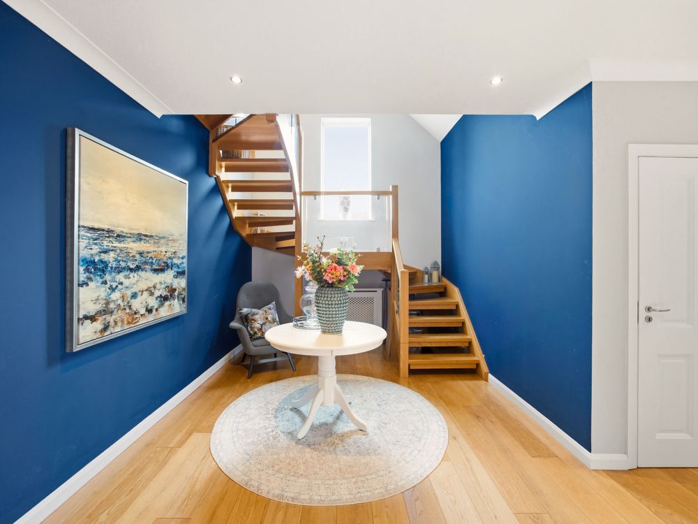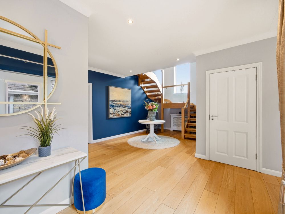 Upon entering, the spacious and light filled hall presents an immediate sense of grandeur, with its high ceilings and feature window enhancing the space, with a contemporary crafted oak staircase providing a distinguished focal point. To the left of the hall, a spacious multi-aspect reception room with double patio doors leading to the garden and a cosy fuel burning stove at its heart.
