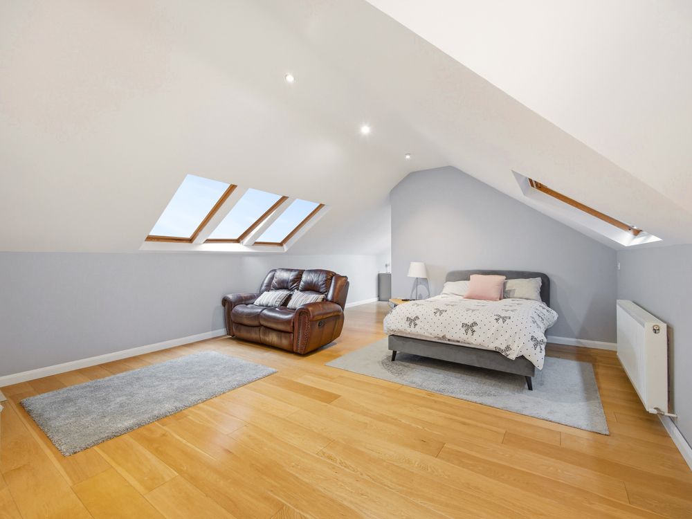 Upstairs the space and style continue with a landing boasting expansive views of the surrounding countryside which leads to a most fantastic multi-functional space. The generous double dormer bedroom is flanked by an amply fitted wardrobe area, all bathed in light from an array of Velux windows. To the rear, a versatile area is currently arranged as a home office, while an elegantly tiled en suite shower room completes this impressive space.