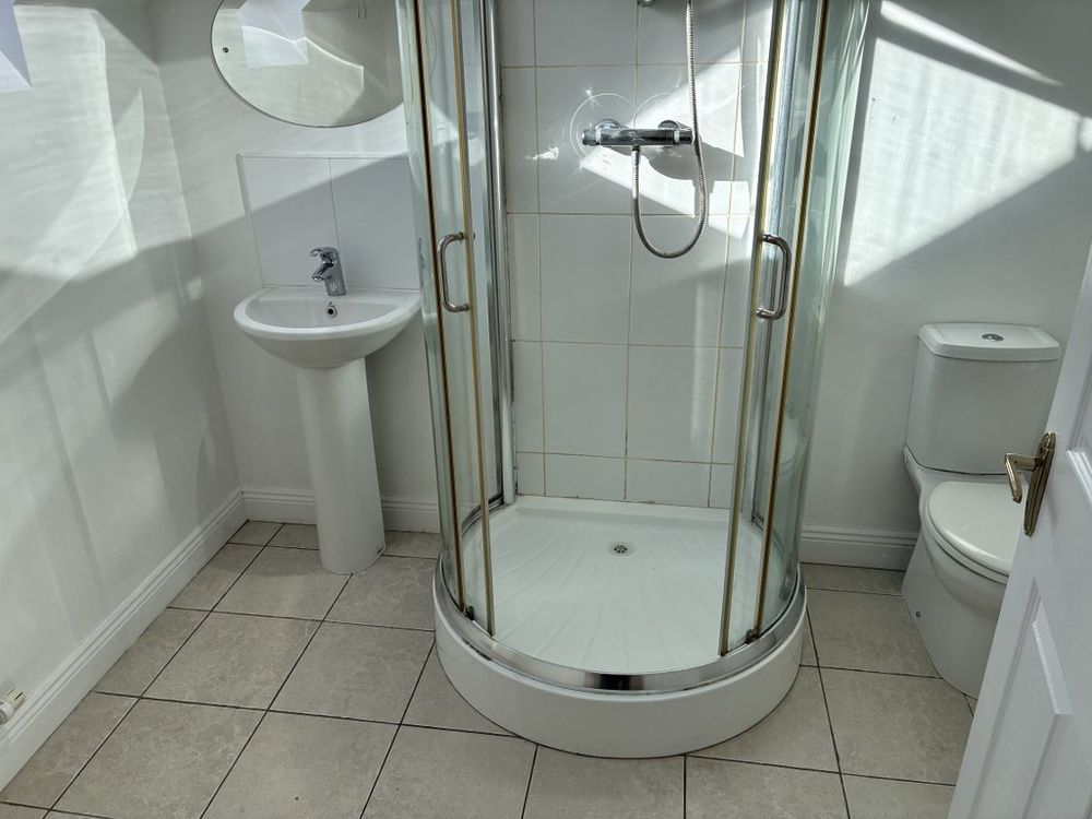 Tiled floor and shower surround. Generous velux window