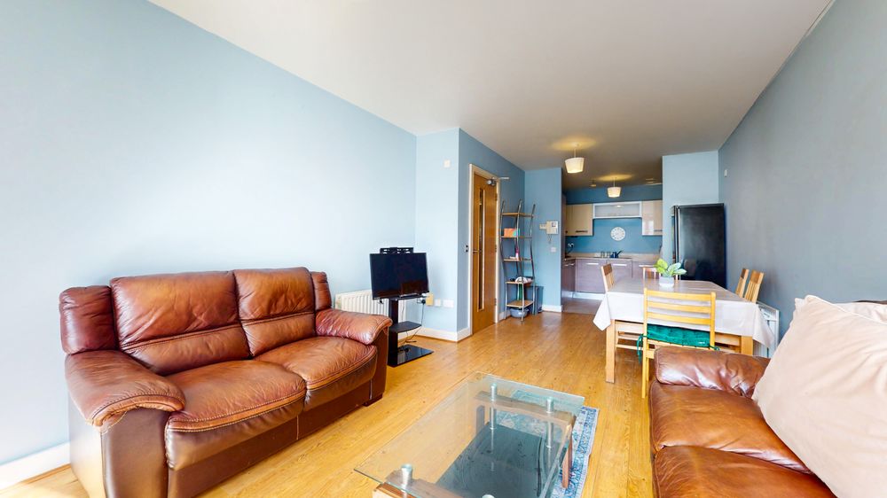 The apartment comprises a welcoming L-shaped entrance hallway, a bright and generously proportioned living/dining area, and a modern fully fitted kitchen. There are three well-sized bedrooms, including a master bedroom with en-suite, along with a stylish main bathroom. Large windows throughout ensure an abundance of natural light, creating a warm and inviting atmosphere.