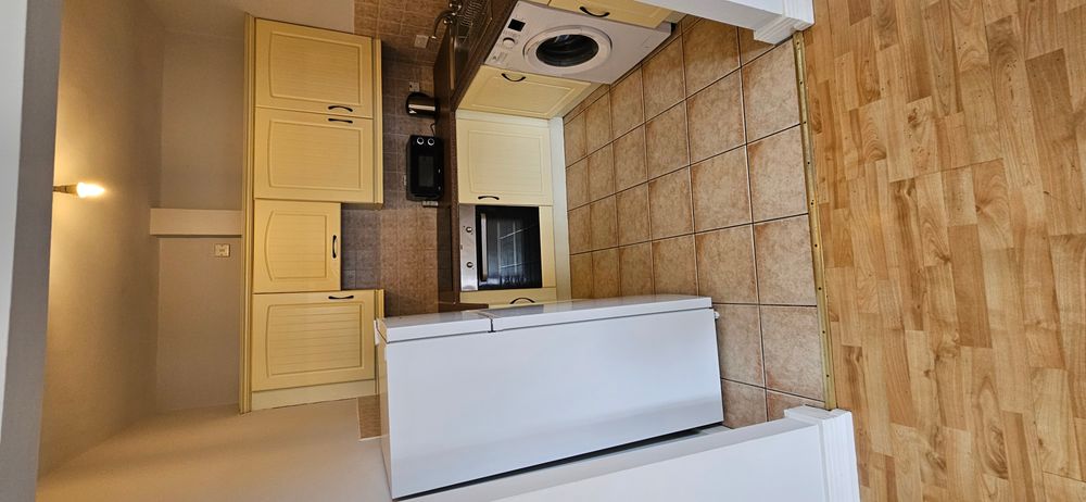 Tiled floor, tiled splash back, fitted kitchen, hob/oven/extractor fan, washing machine, power points.