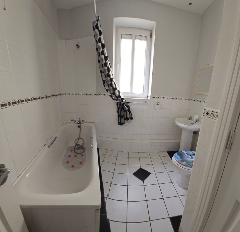 Tiled floor, bath with shower mixer and tiled surround, part tiled walls, recessed lights, wc, whb, fan heater, hot press.
