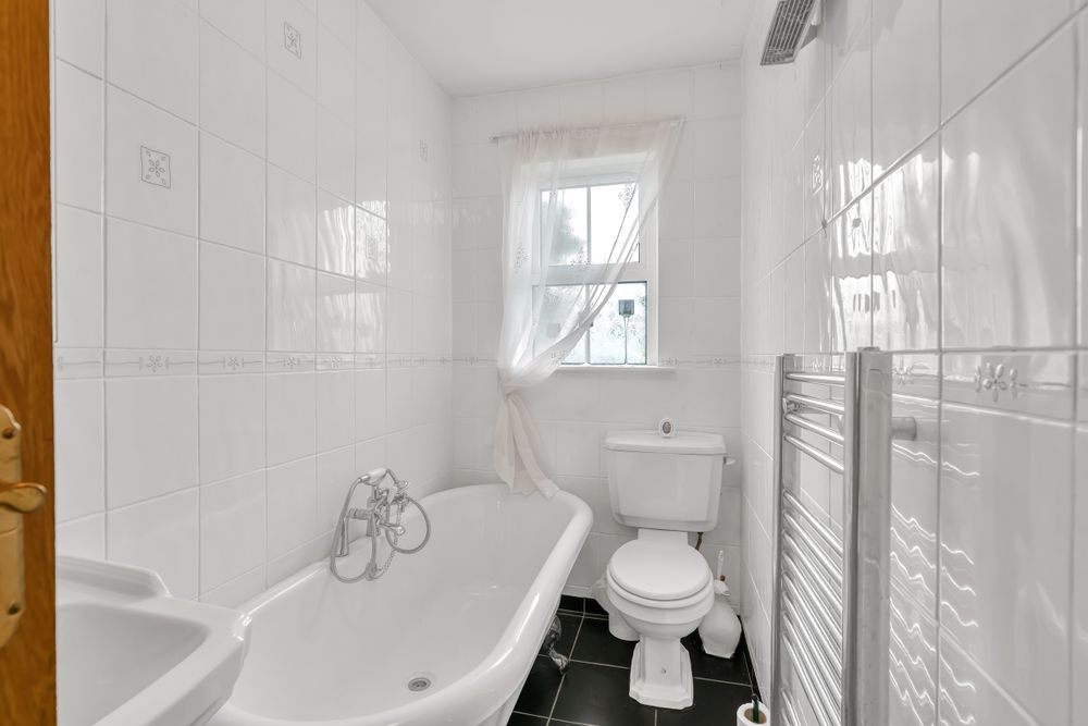 Fully tiled with w.c., w.h.b. and free standing bath, heated towel rail.