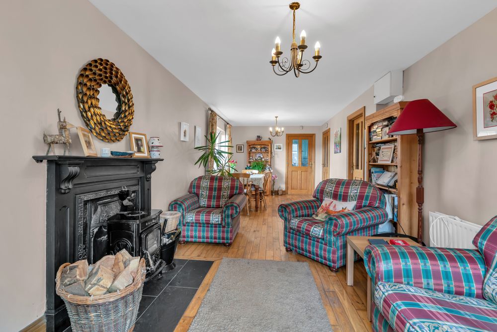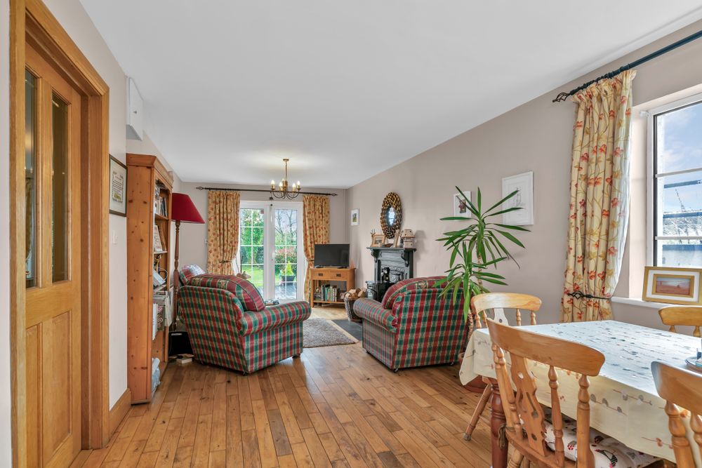 with oak flooring, solid fuel stove with cast iron surround. French doors onto patio area.