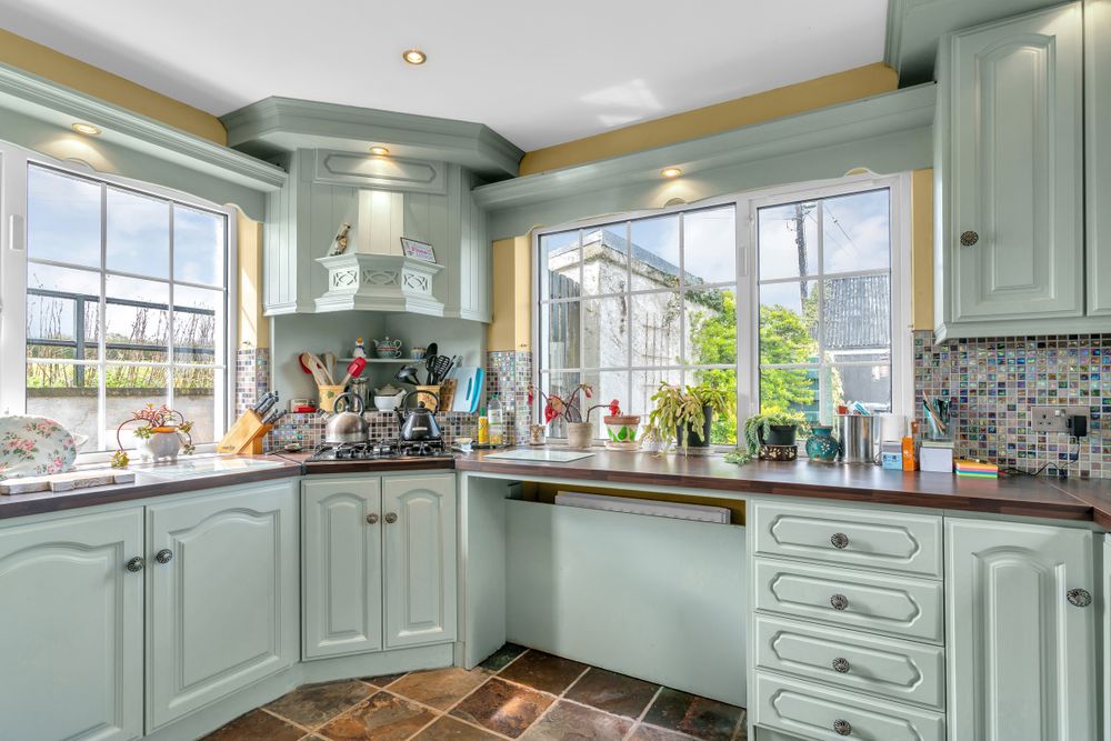 Fully fitted kitchen with ample eye and low level units, gas hob and double oven, tiling to floor and around work counter. Triple aspect windows. Recessed ceiling lights. Glass panel door to living/dining area.