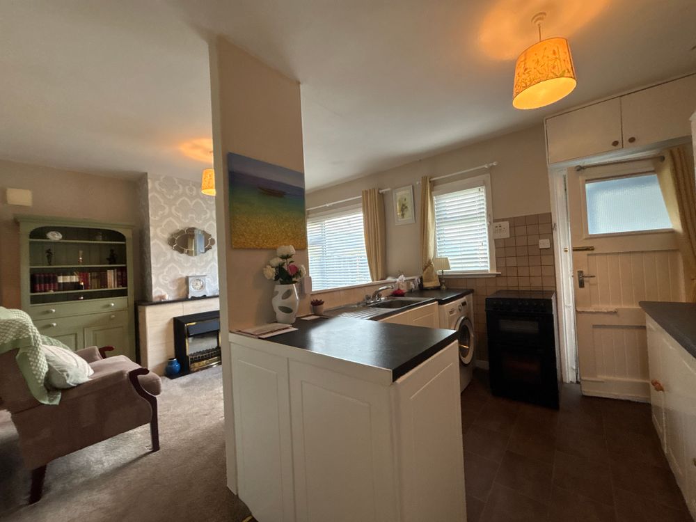 Mixture of tiled and carpet flooring with a tiled backsplash and units at eye and floor level. There is a large window overlooking the rear garden along with a gas fire.