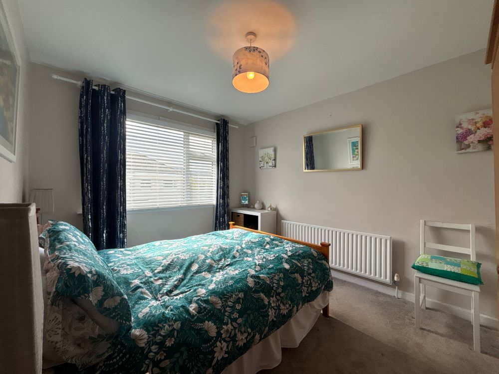 Carpet flooring, built in storage with a large window overlooking the rear garden.