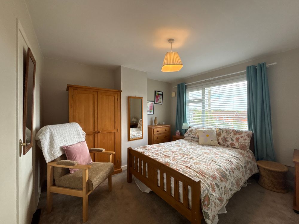 Carpet flooring, built in storage with a large window overlooking the front garden.