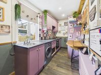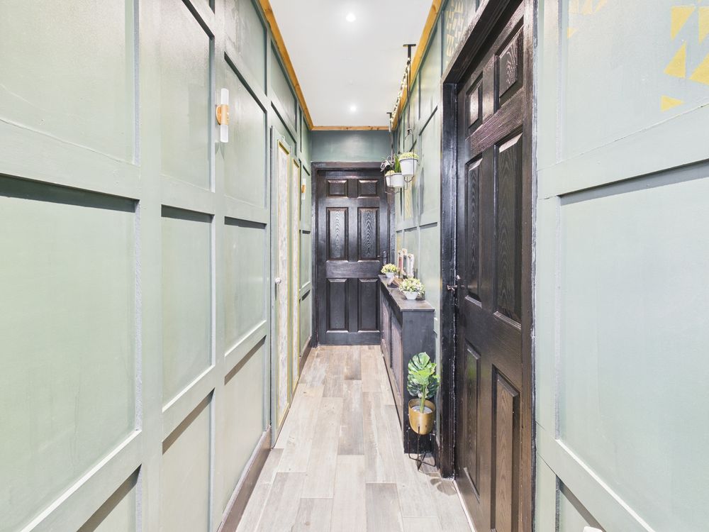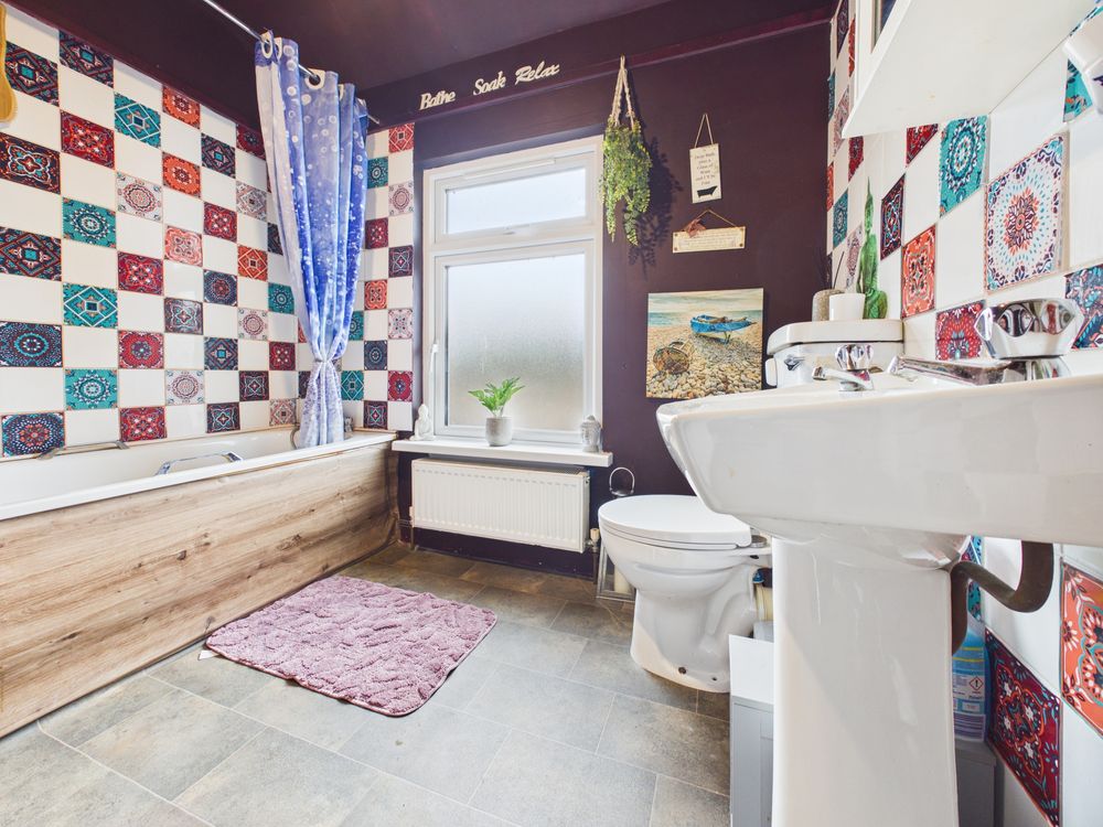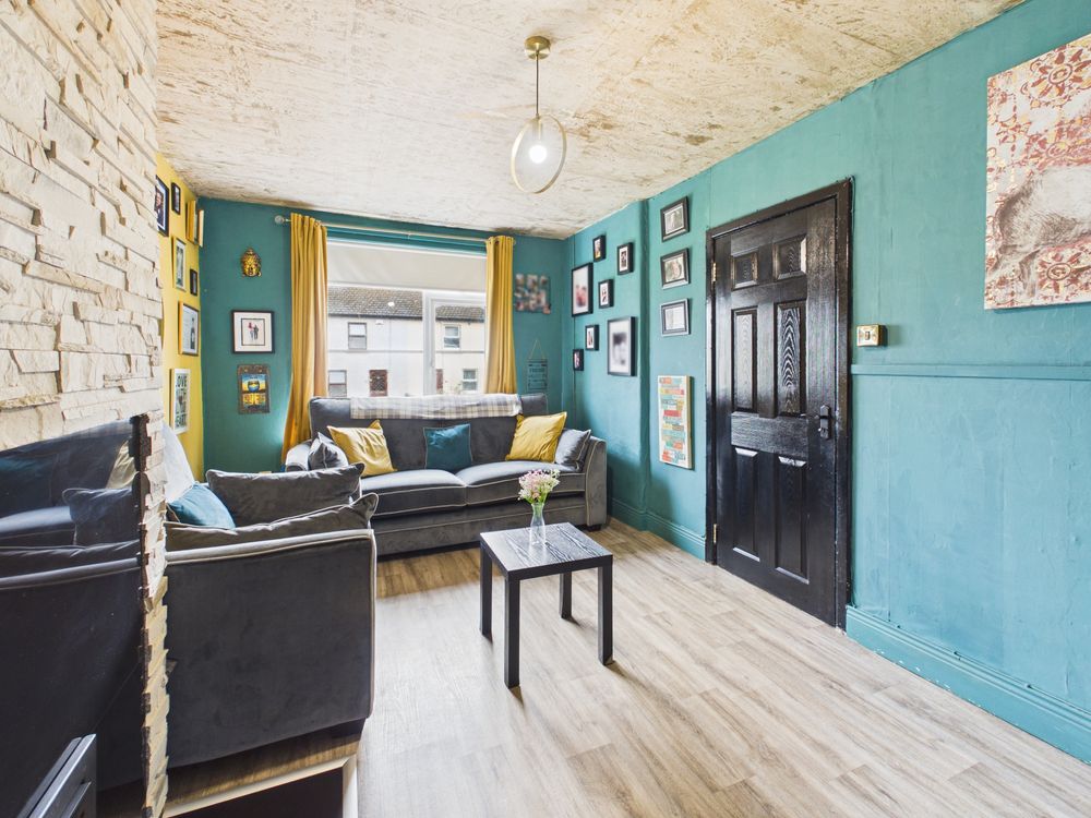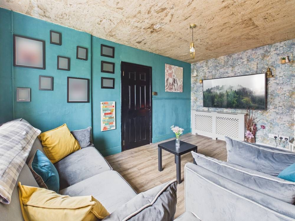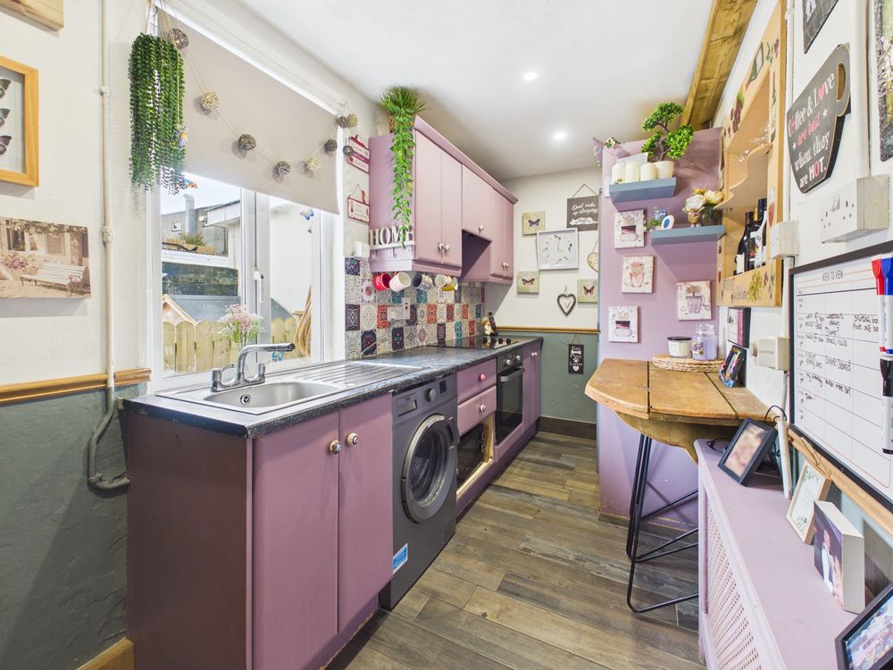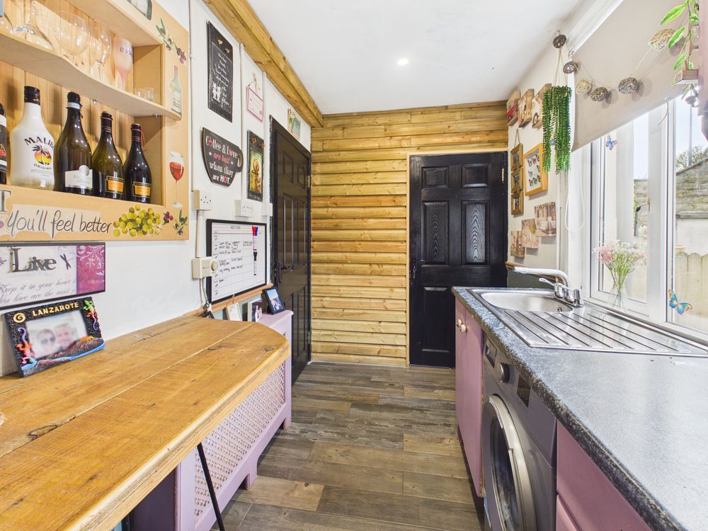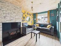 Upon entering, you are greeted by a striking entrance hallway with feature panelling and contemporary finishes, it also includes a hidden understairs storage setting the tone for the stylish interiors that follow . The living room is both cosy and full of personality, with vibrant decor, lino flooring, and a solid fuel stove with back boiler, providing an efficient and practical heating solution while adding to the homely feel of the space.