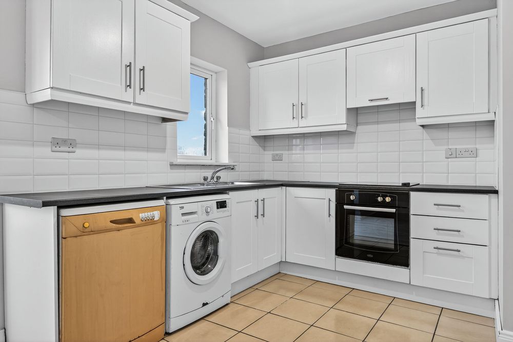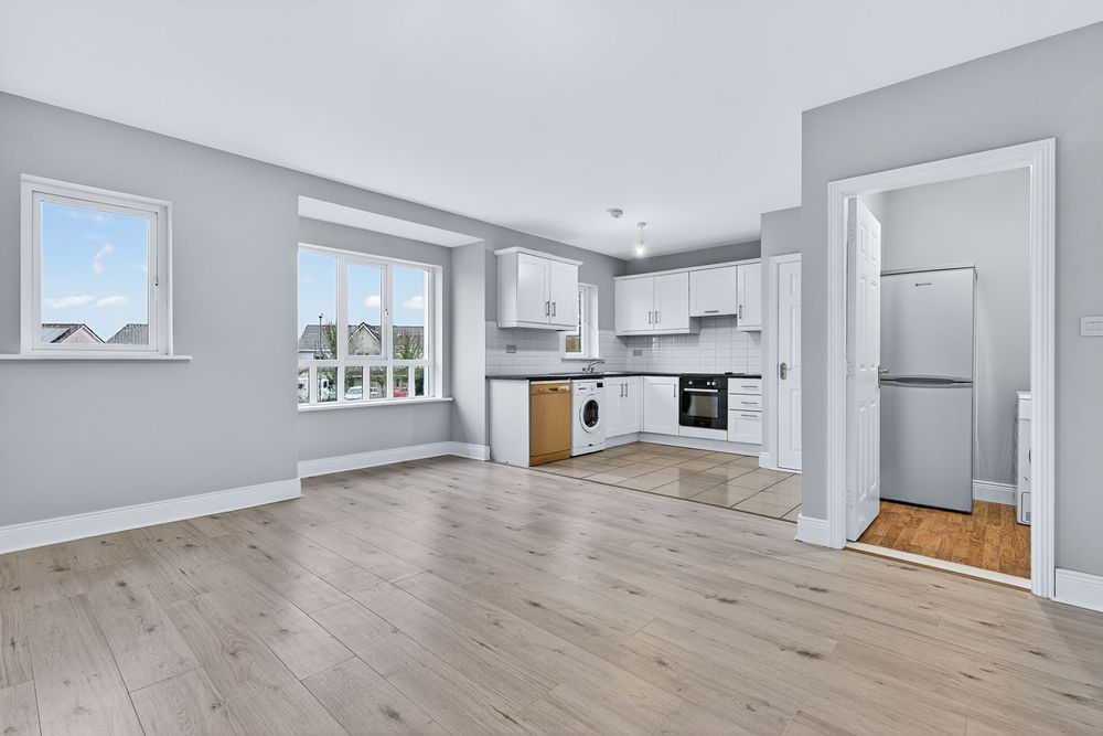 Finished with laminate floor in the dining/living area which has a bay window style feature and a fully fitted kitchen with tiled flooring in the kitchen and tiled back splash. This room has generous natural light from three windows and a large centre window ideal for the dining area overlooks the green area within the scheme. This area also includes a large store room off to the side which would be ideal as a food larder.