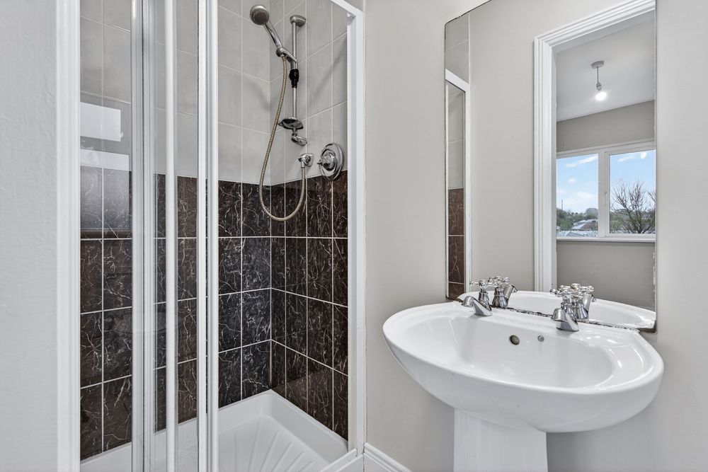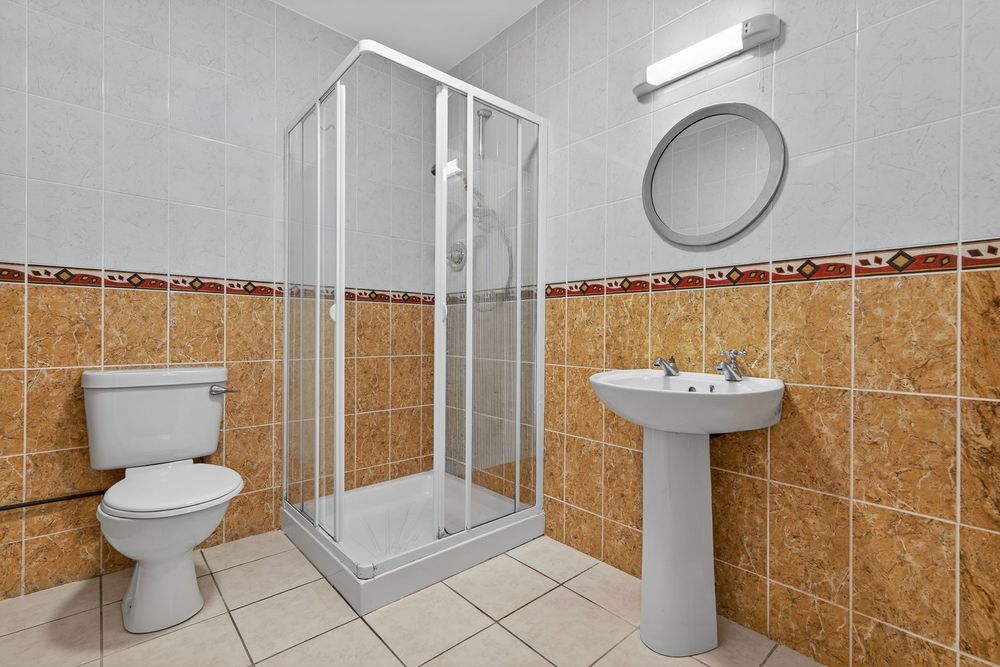 Finished with tiled flooring and walls, includes toilet, wash hand basin and corner shower area.