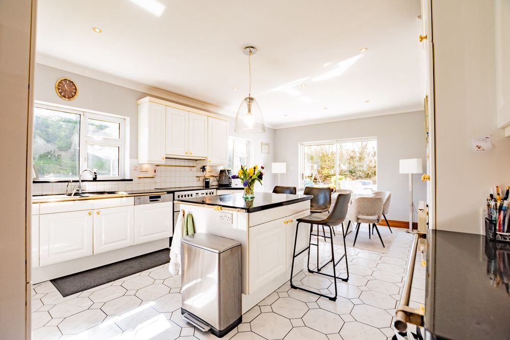 Internally, the accommodation is generously proportioned and exceptionally well-balanced, extending to four spacious bedrooms, two of which benefit from ensuite bathrooms. The principal living accommodation has been designed with both family living and entertaining in mind, comprising a substantial kitchen/dining room fitted with a premium SieMatic kitchen, complete with elegant marble countertops, creating a stylish and functional heart of the home. In addition, there is a formal dining room and an elegant sitting room centred around beautiful marble fireplaces, creating warm and inviting living spaces throughout. The sitting room connects effortlessly to a bright and airy sunroom, overlooking the mature gardens and drawing the outside in.