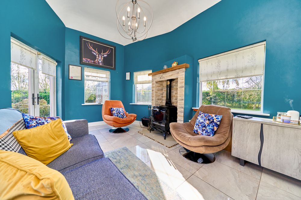 Lovely cosy family room with tiled flooring, high arched ceiling, solid fuel stove with back boiler which provides supplemental heating system. French doors to the south facing patio area & rear garden