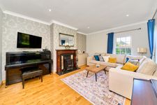Living room front living room with solid wood flooring, ceiling coving, solid fuel stove, TV point