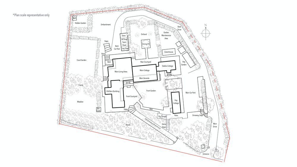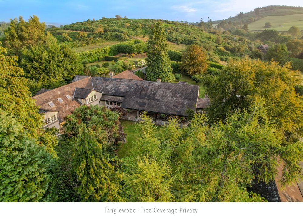 Set on 2 acres, the buildings are positioned in the centre of the plot and surrounded by eight different gardens - Front Lawn Garden; The Woods; The Meadow; The Copse; The Court Garden; The Embankment Garden; The Orchard and The Vegetable Garden. There’s also a tiny secret / concealed garden at the top back of the grounds. Surrounded by trees, and with 12 to 14 foot high boundary hedging, Tanglewood is completely private and secure. The variety of habitats within the grounds have recorded rabbits, foxes, pine martens, shrews, and hedgehogs among its mammal population, and over thirty species of birds including woodpeckers, owls and sparrow hawks, all enjoying the rich ecosystem. Encouraging biodiversity has always been an important mission for the current owners.