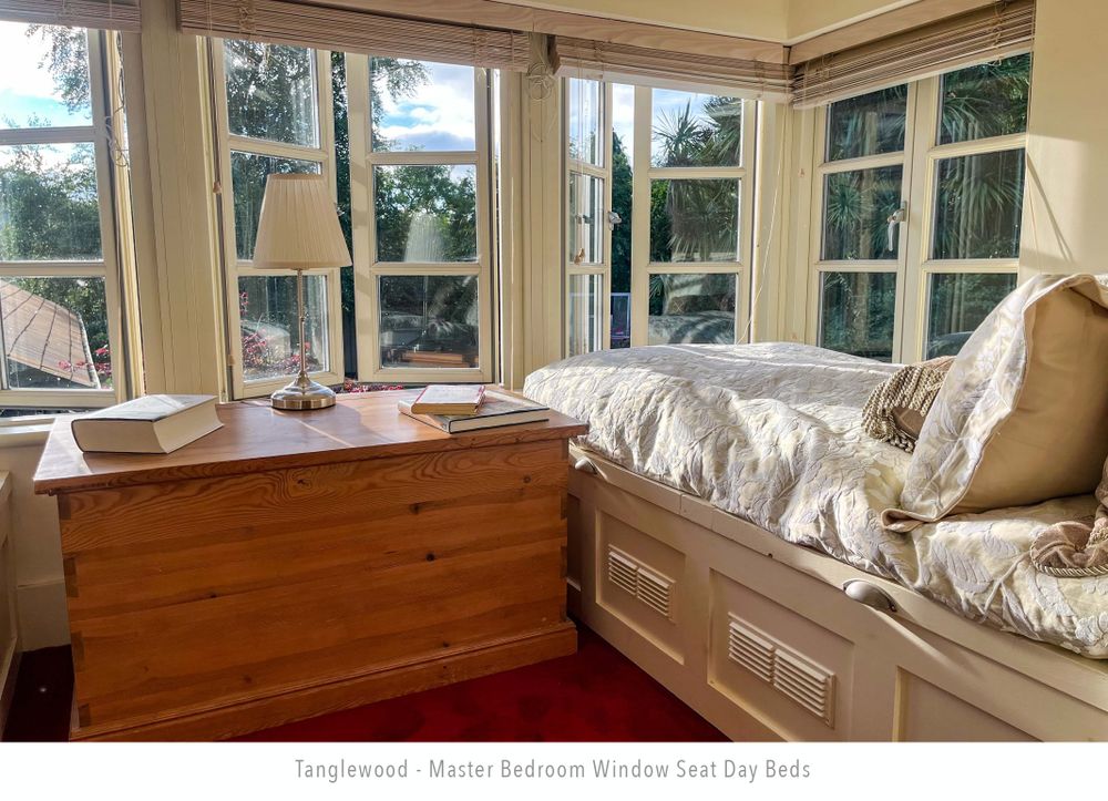• The Master Bedroom is a serene and spacious retreat, kept solely as a restful haven. A large bay window invites in natural light and offers sweeping views of the surrounding landscape—perfect for reading or simply unwinding. Two daybeds are thoughtfully positioned at the window, while the main sleeping area is situated separately within the room to maintain its restful ambiance.